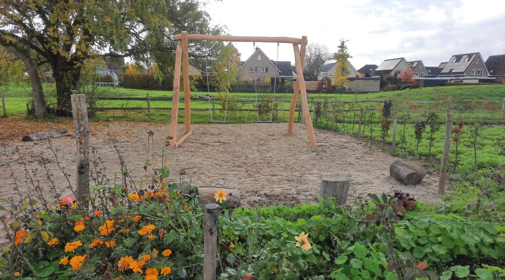 De metamorfose van onze natuurspeelplaats had heel wat voeten in de aarde (in het zand) en is met inspanning van een grote groep vrijwilligers gelukt! Er zijn twee schommels geplaatst en een steltenpad.
