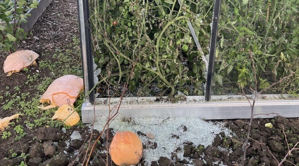 Helaas lopen er soms kinderen het EcoPark op die niet alleen hun eigen moestuin willen verzorgen of even in de natuurspeelplaats willen verblijven. Maar om nu met andermans pompoenen een ruit van veiligheidsglas in het kweekkasje in te gooien? Dat doet ons als moestuiniers, die hier zorgen dat ook onze kinderen gezond eten op tafel krijgen, toch heel erg pijn. Het hele EcoPark is met spaarzame middelen opgebouwd en nu zien we dit.